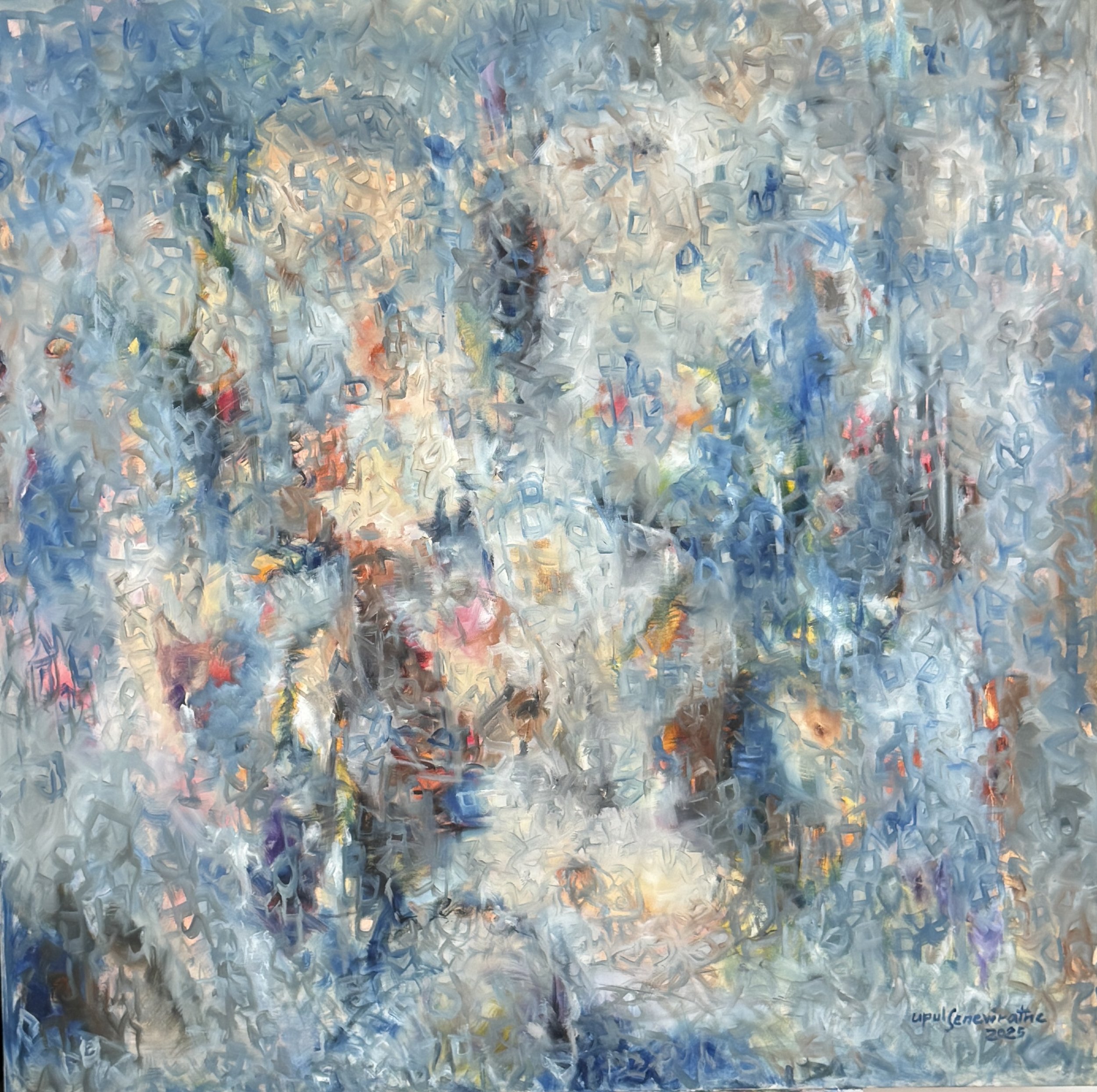 “Soul Bloom” emerges through soft blurs of blue and white, gently touched by hints of brown, while sudden bursts of orange rise like sparks of awakening. The hazy layers suggest a quiet transformation, as if the soul is unfolding from within a veil of stillness into renewed light.The cool tones carry a sense of calm rebirth, while the warm accents pulse with life, symbolizing new breath and the fragile yet radiant arrival of hope. Nothing is sharply defined, allowing the painting to feel like an inner awakening rather than a visible form. In its delicate diffusion of color and light, “Soul Bloom” becomes a poetic reflection of renewal—where hope quietly blossoms, and life begins again with a gentle, luminous breath.